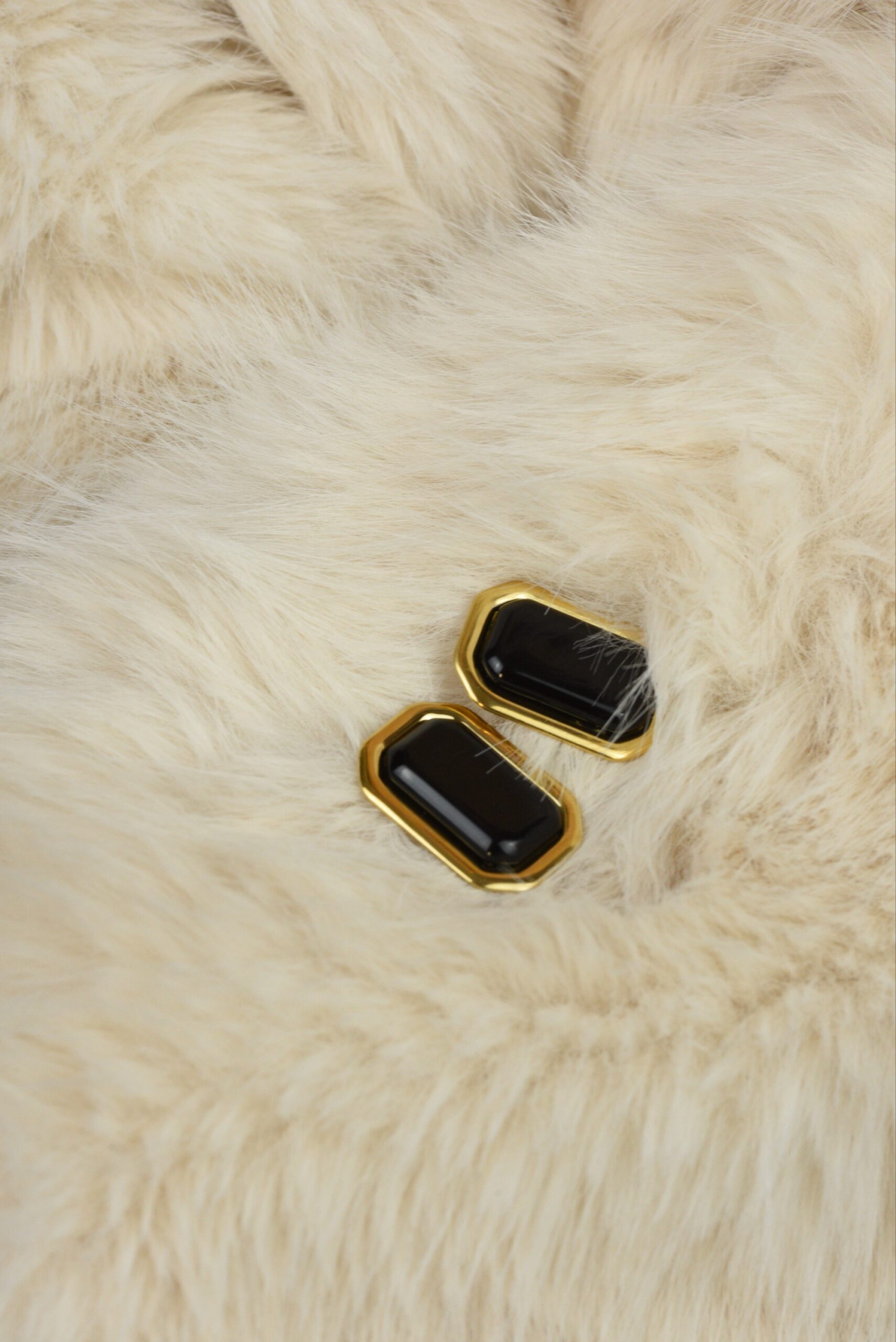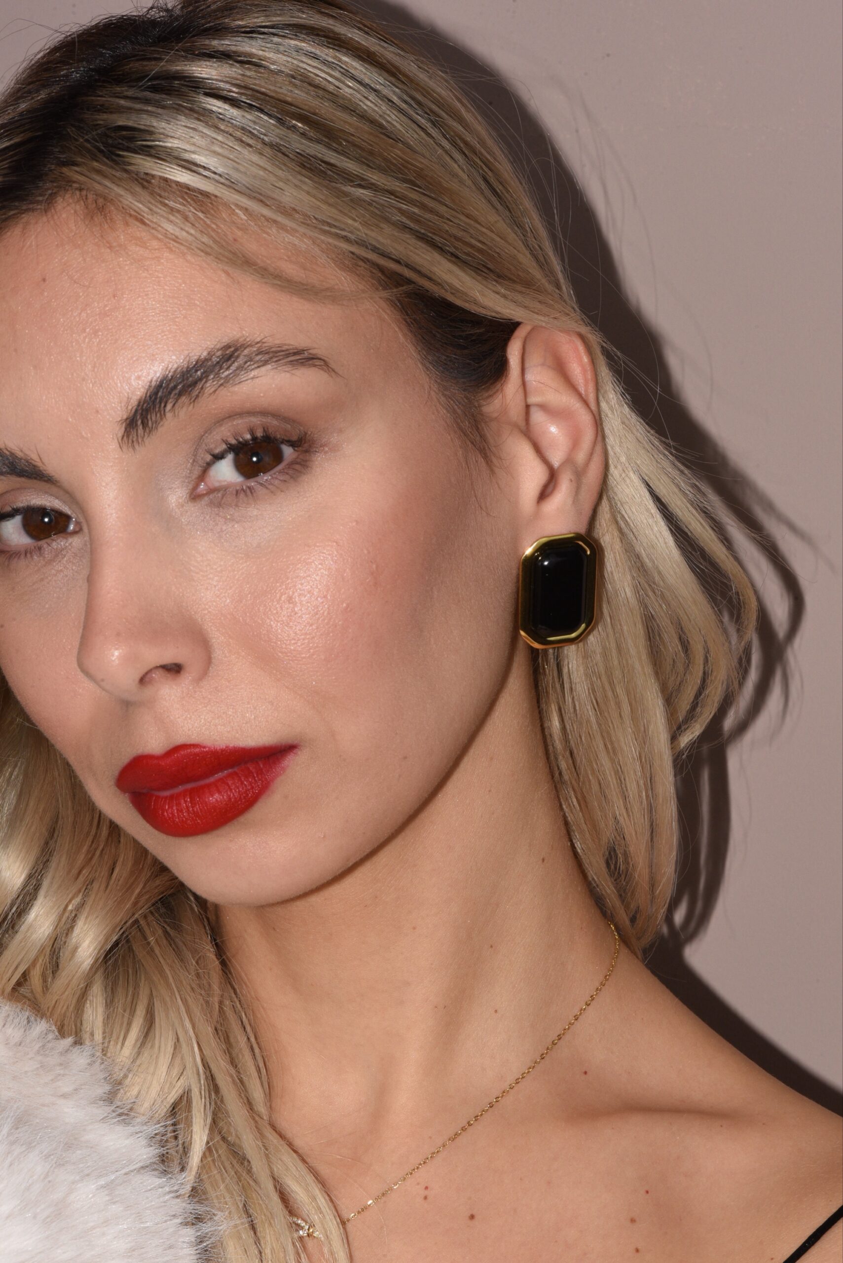 vintage τετραγωνισμένα σκουλαρίκια με μαύρη ή κόκκινη πέτρα και χρυσό περίγραμμα. Έντονα, κομψά και ατμοσφαιρικά. Από υψηλής ποιότητας επιχρυσωμένο ατσάλι.